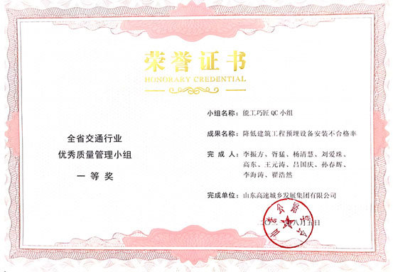 近日,山東公路協(xié)會公布了全省交通行業(yè)優(yōu)秀質(zhì)量管理小組表彰名單,城鄉(xiāng)發(fā)展集團質(zhì)量管理成果《降低建筑工程預(yù)埋設(shè)備安裝不合格率》榮獲“2021年全省交通行業(yè)優(yōu)秀質(zhì)量小組一等獎”。
